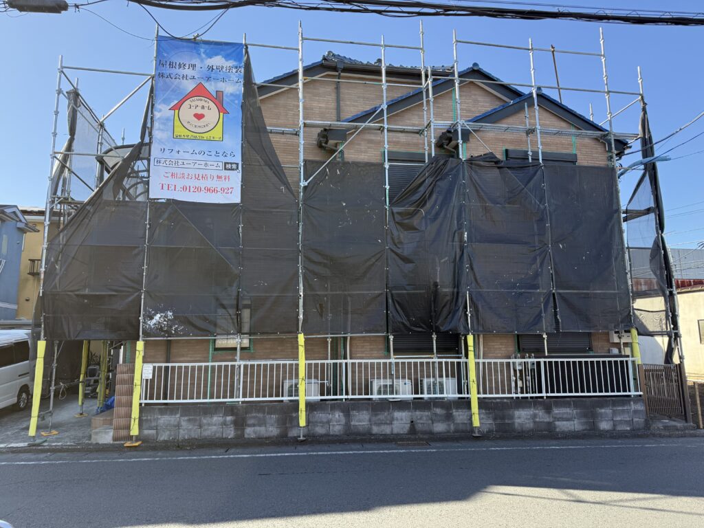 外壁塗装工事 相模原市 着工 2025-12-12 最終更新日時 : 2025-12-22 nakayama1102 相模原市南区I様邸にて外壁塗装工事着工しました! これからキレイにしていきます😊 強風対策でメッシュシートは半分巻いています🌪️