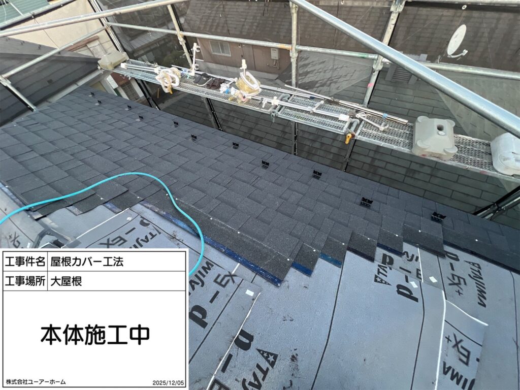 新しい屋根はクッション性のあるシングル材を使用しました。