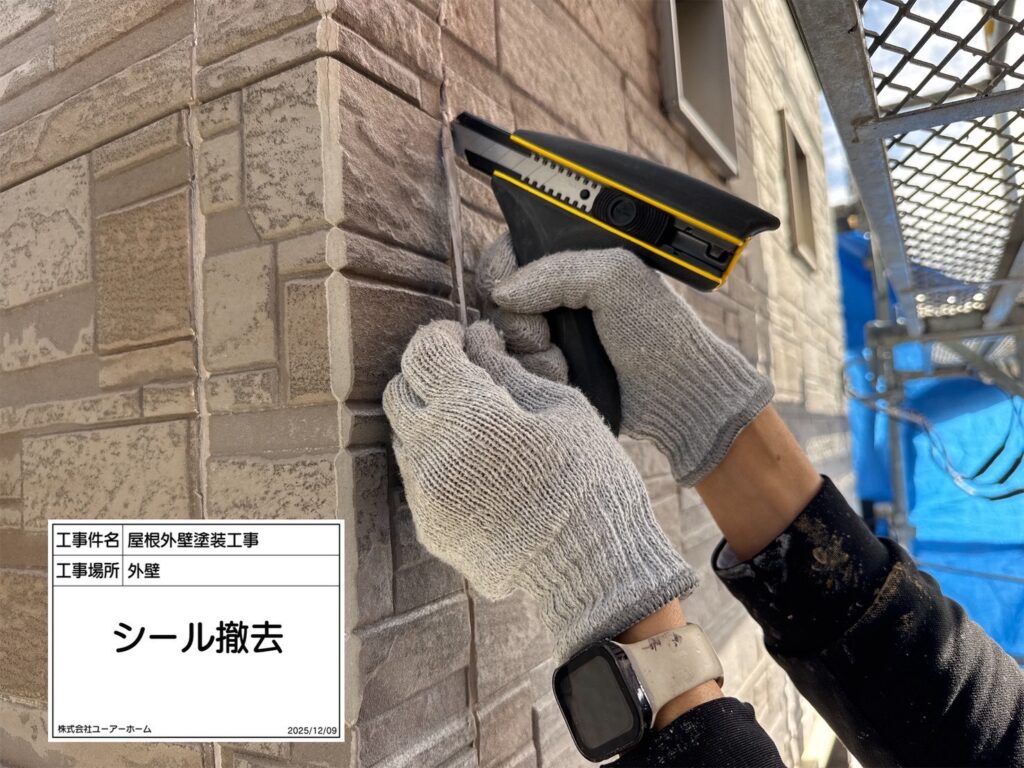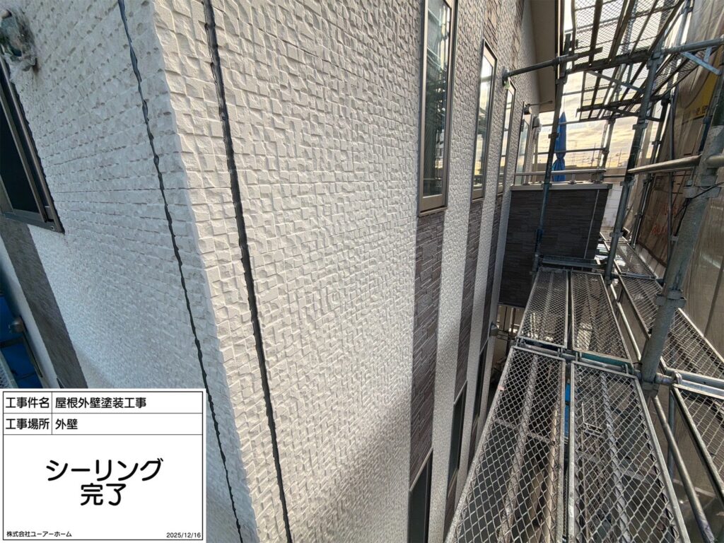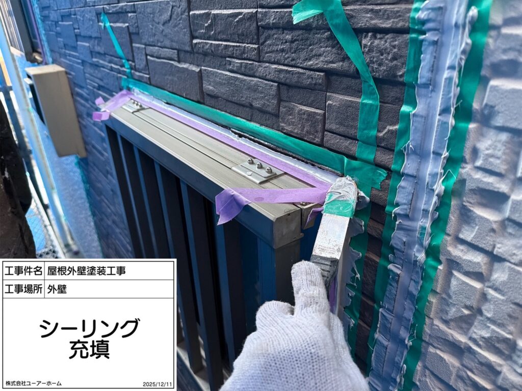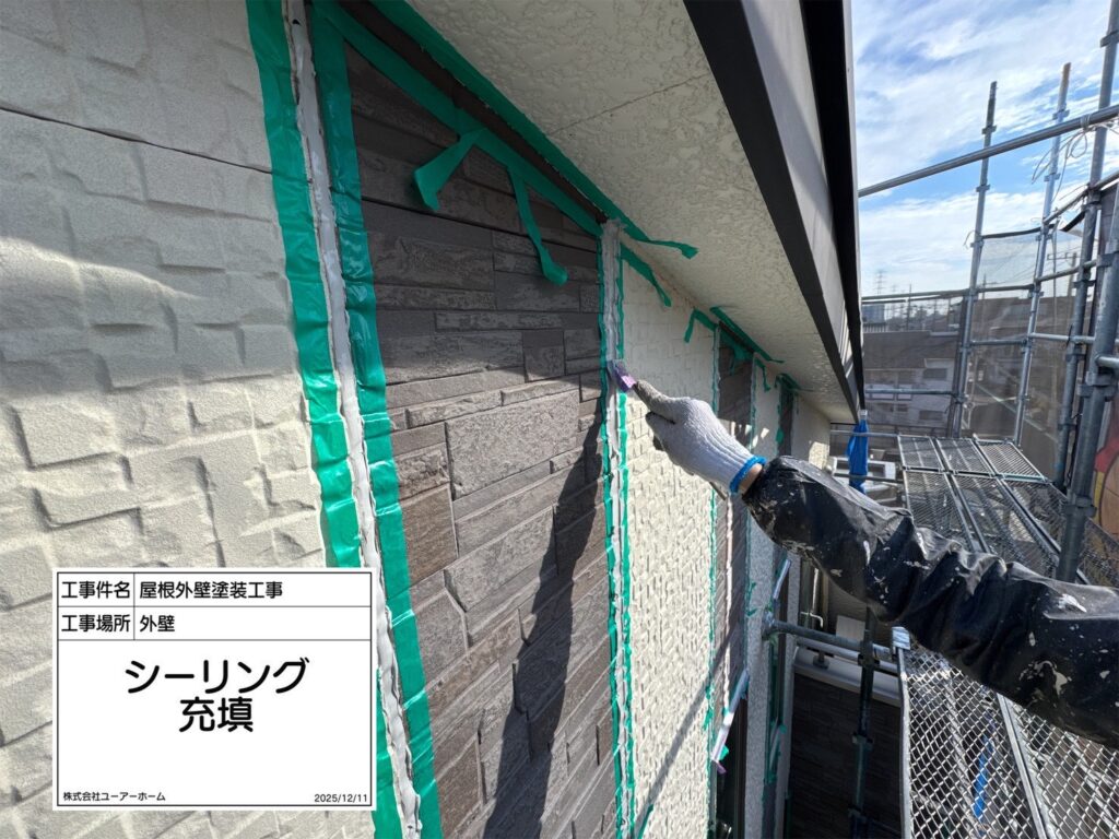 外壁の上塗りで使う色に合わせてシーリングの色も使い分けています。