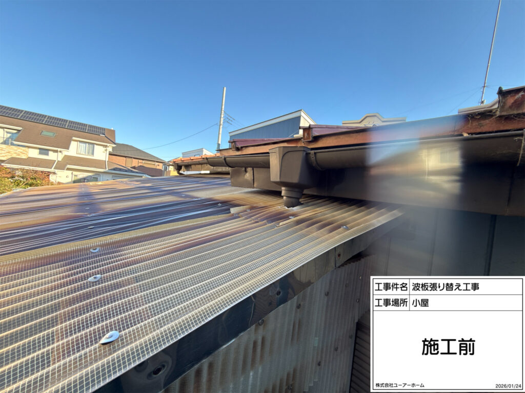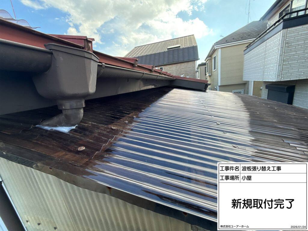 屋根(小屋)修理 相模原市リフォーム 施工事例 2026-02-02 最終更新日時 : 2026-02-02 nakayama1102 相模原市南区Y様邸にて小屋のポリカ波板張り替え工事お任せいただきました! 【工事内容】 9尺ポリカ7枚、6尺ポリカ1枚張り替え 参考価格 : 約75,000円(税抜) 工事ご依頼ありがとうございました😊