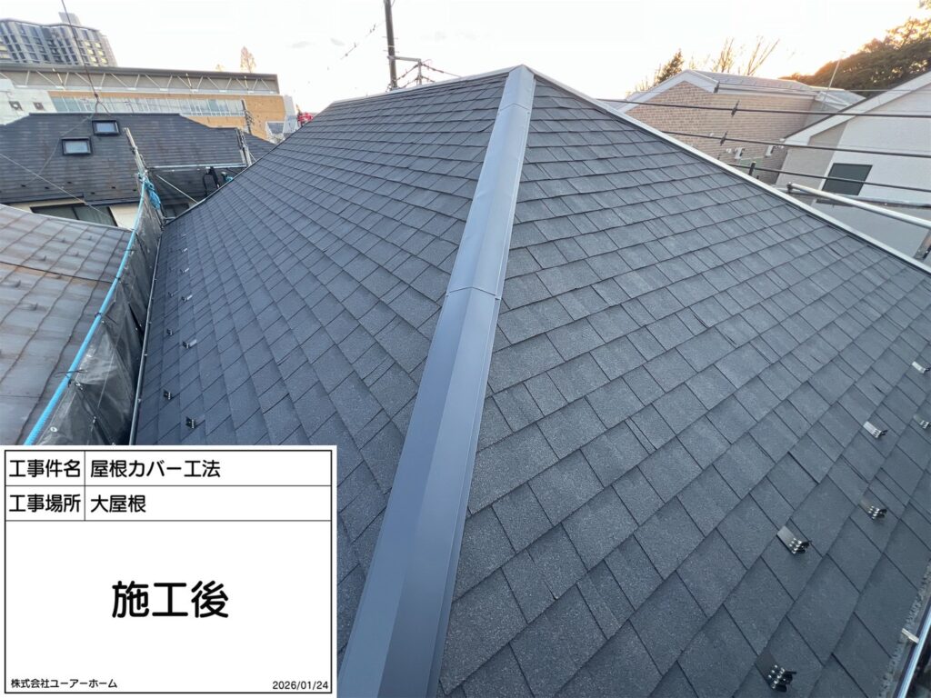 屋根カバー工法 : シングル材(オークリッジスーパー)オニキスブラック使用